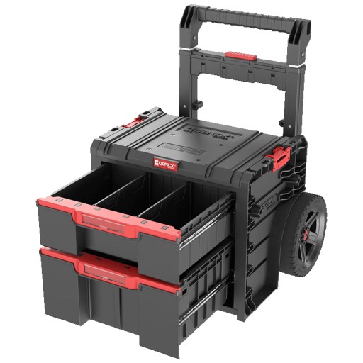 Qbrick System PRO Cart 2.0 Plus Drawer 2, a mobile solution that combines the convenience of transport with the excellent organization of tools The box is equipped with large 9-inch wheels covered with a thick layer of rubber that guarantee excellent traction even in the most difficult off-road conditions. With a telescopic double handle that can be removed and a comfortable foot platform, it allows for easy maneuverability in a small space.