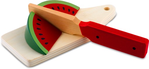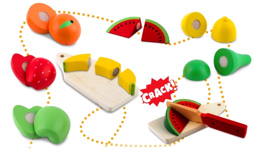 - Zestaw składa się z drewnianych owoców, które można rozkrajać na kawałki, co wspiera interaktywność.