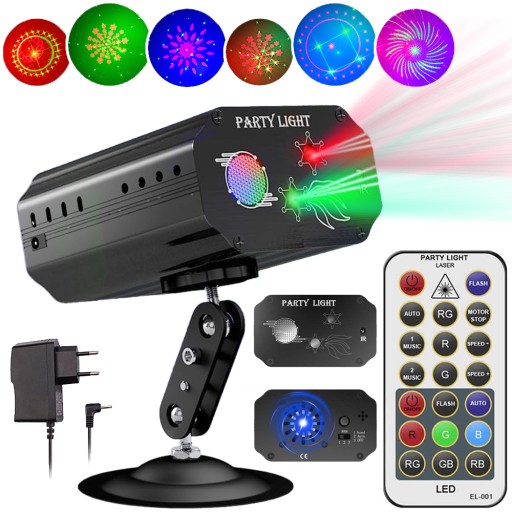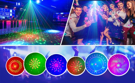 - Światło dyskotekowe składa się z 6 kolorów (Czerwony/Zielony/Niebieski/Różowy/Jasnoniebieski/Pomarańczowy) i 24 różnych wzorów, co daje wyraźniejszy obraz bez rozmycia w porównaniu ze zwykłymi lampkami imprezowymi.