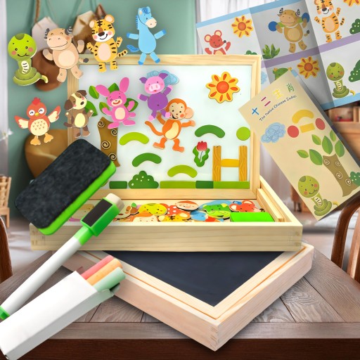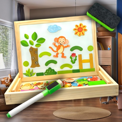 Dwustronna tablica edukacyjna to doskonały prezent dla każdego dziecka! Z jednej strony znajdziemy powierzchnię suchościeralną, idealną do rysowania i pisania markerami, a z drugiej magnetyczną – w zestawie aż 70 magnesów.