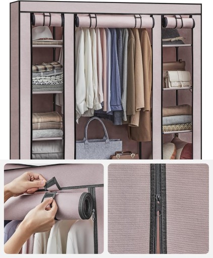 - Stabilna szafka z materiału, z drążkiem na ubrania, 12 półkami, osłoną z włókniny zapinaną na zamek błyskawiczny i rzepy.
