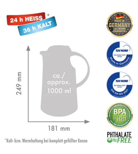 Klasyczny i wytrzymały dzbanek do codziennego użytku. Utrzymuje temperaturę do 24 h w przypadku gorących napojów oraz do 36 h w przypadku chłodnych.
