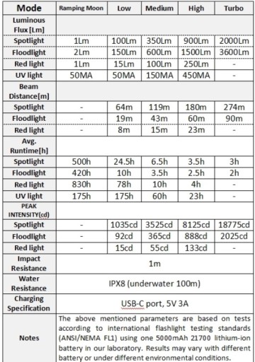 * Do latarki nie są dołączone baterie, wymaga zakupu 1 baterii 21700