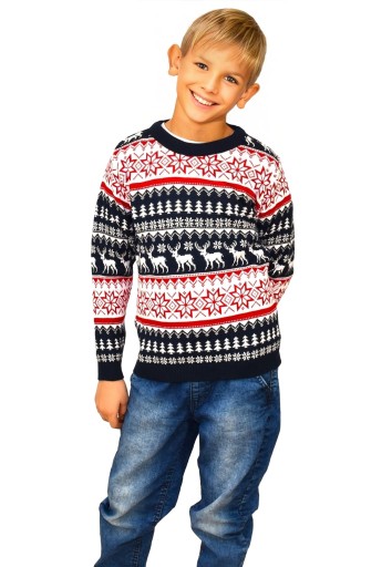 Ciepły sweterek w kolorze granatowym w biało-czerwony norweski wzór. Na swetrze widnieją renifery, gwiazdki, choinki. Sweter posiada okrągły dekolt. Rękawy i dół swetra zakończone są ściągaczami. Sweter jest gruby, ładnie uszyty.
