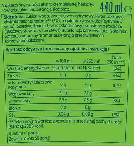 1 koncentrat wystarcza na przygotowanie ok. 9 L napoju* według zaleceń producenta dotyczących rozcieńczania koncentratu z wodą.
