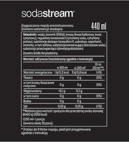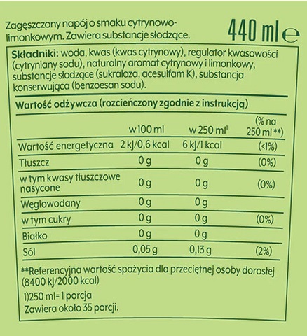 1 koncentrat wystarcza na przygotowanie ok. 9 L napoju* według zaleceń producenta dotyczących rozcieńczania koncentratu z wodą.