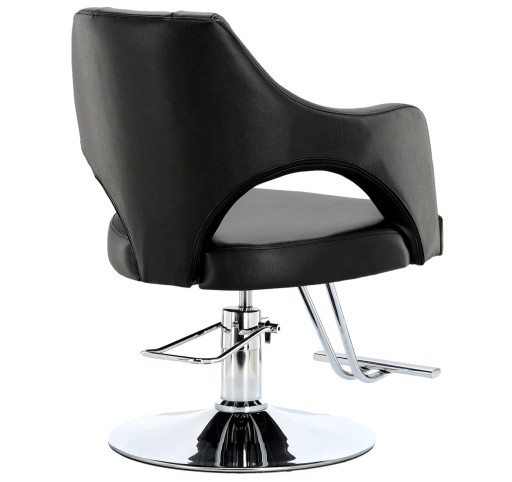Fotel charakteryzuje się eleganckim i ergonomicznym designem, który pozwala na wygodną pracę fryzjera oraz relaks klientów.
