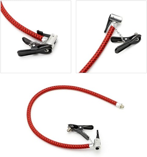 - Jedyne w swoim rodzaju wzornictwo: elastyczny wąż z głowicą Schradera i klipsem, łatwe podłączenie do pompki