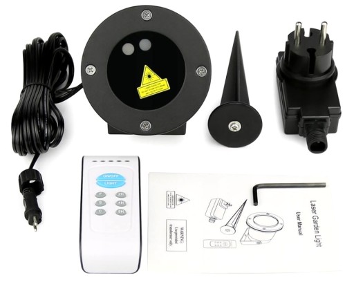 Bogaty pakiet dodatków : Nowy projektor laserowy Star shower Laser RG , Pilot zdalnego sterowania + Bateria CR2025 , Przewód zasilający dł. kabla ok. 4,85m dedykowany zasilacz sieciowy 230V , Aluminiowy szpikulec , 3 śruby montażowe z podkładkami , hermetyczne końcówki zasilacza