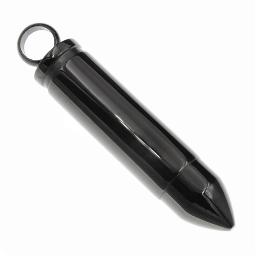 Zawieszka sekretnik w kształcie naboju. Wykonana z najwyższej jakości stali chirurgicznej 316L anodowanej na czarno. Wisiorek wypolerowany na wysoki połysk. Zawieszka posiada ściąganą zakrętkę, dzięki czemu można służyć jako mały schowek.