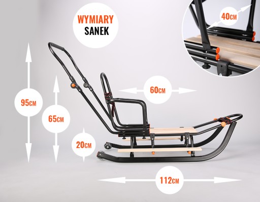 - Przy płozach zamontowane są kółka umożliwiają wygodne pokonywanie nieośnieżonych odcinków trasy.
