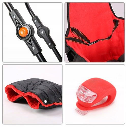 W komplecie są: sanki,oparcie,pchacz (regulowana wysokość), śpiwór, budka, śruby, podnóżki, PAS do przypięcia dziecka , kółka i mufka