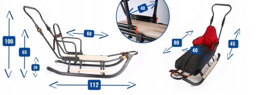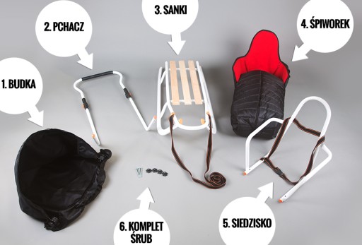 W komplecie są: sanki,oparcie,pchacz (regulowana wysokość), śpiwór, budka, śruby, podnóżki, PAS do przypięcia dziecka ,
