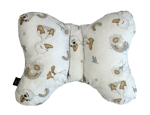 Poduszka motylek ma za zadanie zapobiegać wstrząsom główki dziecka podczas podróży w wózku lub foteliku.