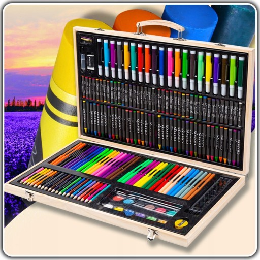 ХУДОЖЕСТВЕННЫЙ НАБОР ДЛЯ РИСОВАНИЯ ДЕТЕЙ МАРКЕТАМИ, МЕЛКАМИ + ДЕРЕВЯННЫЙ ЧЕХОЛ