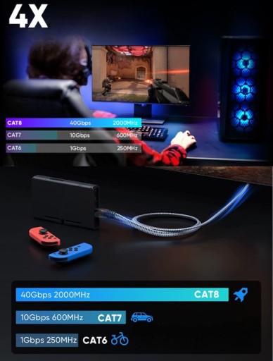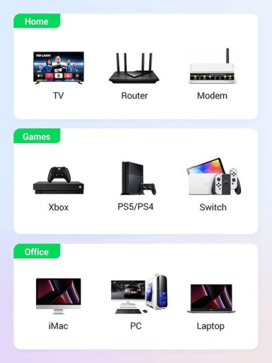 Dzięki złączu RJ45 ten kabel Ethernet do gier może być doskonale kompatybilny z komputerami, laptopami, modemami, routerami, PS5, PS4, PS6, X-Box 660, X-Box One, Switch, przełącznikami sieciowymi, ADSL, adapterami sieciowymi, koncentratorami i innymi urządzeniami sieciowymi. Może być również w pełni wstecznie kompatybilny z Cat7, Cat6e, Cat6, Cat5e, Cat5.