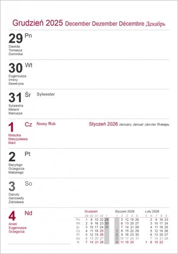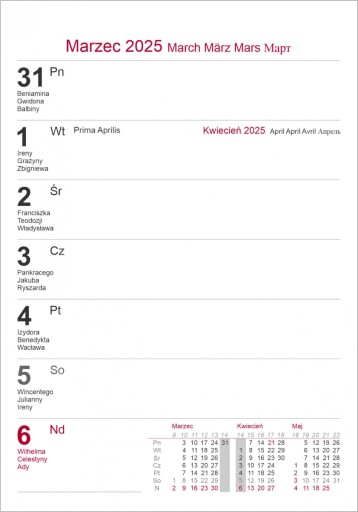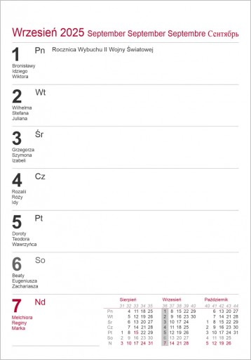 Kalendarium obejmuje cały okres roku 2025. Na każdej kartce znajdujemy przejrzyste skrócone kalendarium poprzedniego, bieżącego oraz kolejnego miesiąca z numeracją tygodni oraz z wyróżnionym aktualnym tygodniem. Dzięki tym wszystkim informacjom kalendarz jest bardzo praktyczny i łatwo z jego pomocą zachować kontrolę nad realizacją zadań oraz zbliżającymi się terminami.