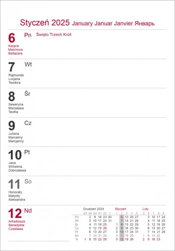 Dodatkowo w kalendarium zaznaczono imieniny, święta państwowe i religijne. Na początku kalendarium umieszczony jest przejrzysty plan całego roku 2024, 2025 oraz 2026.