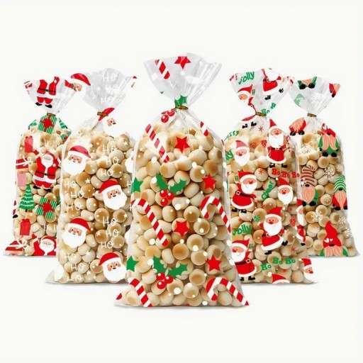 50 sztuk świątecznych torebek na cukierki z wiązaniami, 5-pak kolorów, plastikowe ozdobne torebki na smakołyki na świąteczne upominki i prezenty