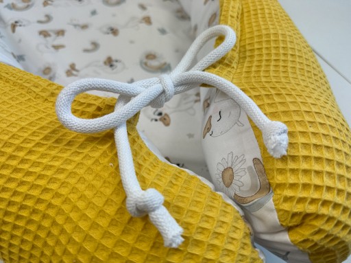 Kokon można według uznania odwracać - na zdjęciu widoczny na zewnętrznej stronie delikatny velvet a wewnątrz gładka bawełna ze wzorem. Po rozwiązaniu sznurka ściągającego kokon można wywrócić na druga stronę. Dzięki czemu velvet będzie znajdował się wewnątrz kokonu, a wzór na zewnętrznej stronie.