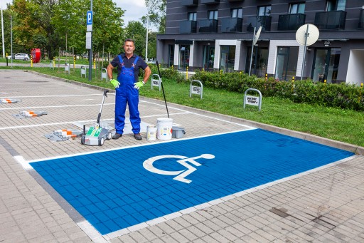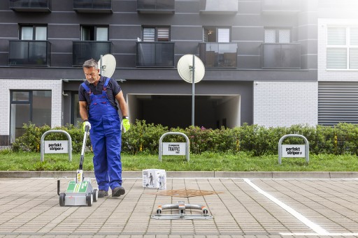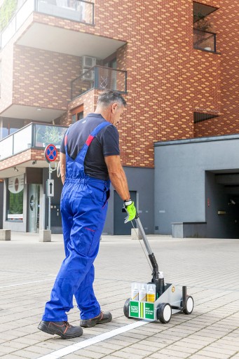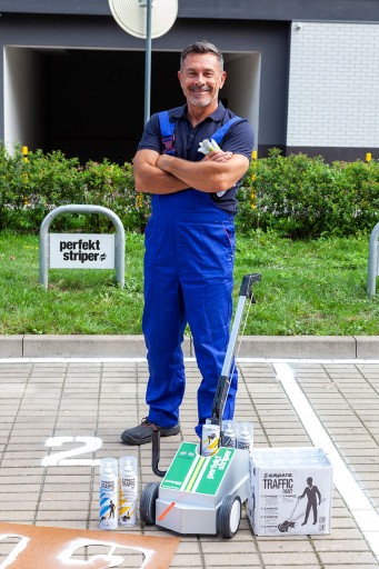 Urządzenie znakujące posiada funkcjonalny uchwyt z przyciskiem. Możemy wykonać nim linie o szerokości od 5 do 10 cm. Puszka samoczynnie przyjmuje właściwą pozycję dopasowując się w uchwycie. Wózek posiada szerokie koła co sprawia, że znakowanie linii staje się bardziej stabilne i precyzyjne. Przyrząd posiada stojak boczny który pozwoli na znakowanie wzdłuż ścian, palet czy maszyn. Dodatkowo w konstrukcji wózka została zaprojektowana półka na której zmieszczą się trzy spraye.
