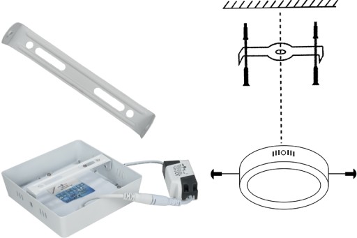 Montaż natynkowy pozwala Ci na oszczędzenie czasu oraz nieodwracalnego uszkodzenia sufitu. Wystarczy, że przykręcisz metalowy uchwyt (w zestawie) do sufitu, a następnie uprzymocujesz do niego panel LED. Wkręty kołki niezbędne do montażu są dołączone do zestawu.