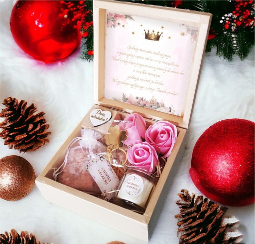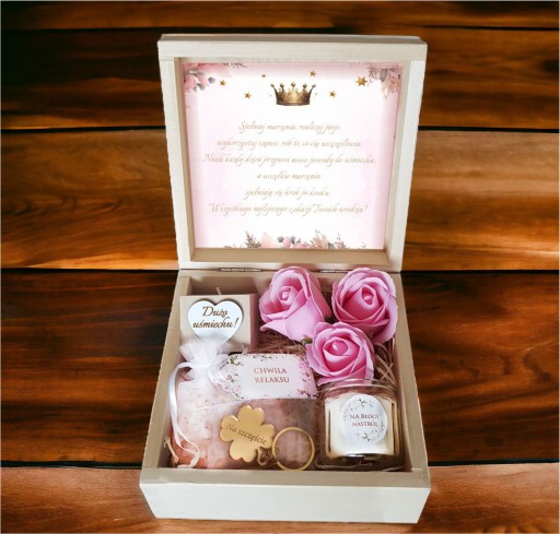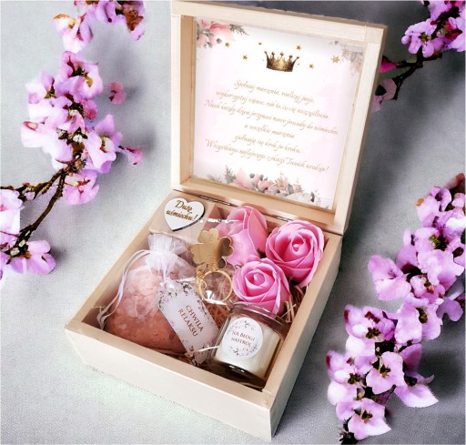 Całość ułożona na naturalnej wełnie drzewnej, prezentuje się wyjątkowo stylowo, czyniąc skrzynkę idealnym prezentem na urodziny dla każdej kobiety.