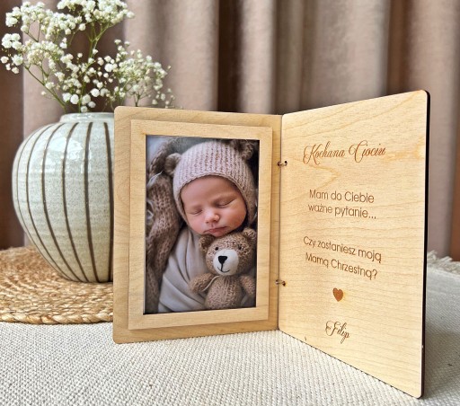 Przepiękne zaproszenie na chrzest dla mamy chrzestnej. Drewniana otwierana kartka z ramką na zdjęcie i prośbą o zostanie mamą chrzestną.