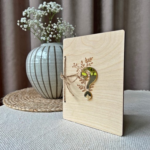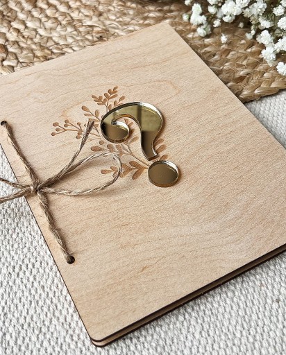 Kartka przewiązana sznurkiem jutowym. Front kartki zdobi złoty znak zapytania.