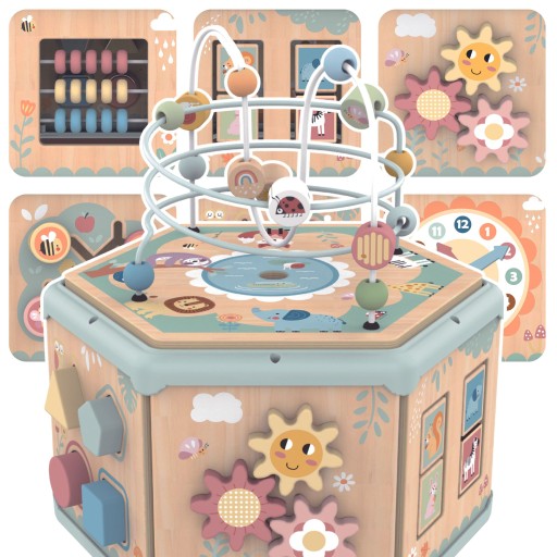Drewniany multifunkcyjny sześciokąt z 7 aktywnościami od marki TOOKY TOY to interaktywna zabawka edukacyjna, która oferuje wiele różnych rodzajów zabawy na każdej ze swoich siedmiu stron. Dzieci mogą przesuwać koraliki w labiryntach, obracać koła zębate, dopasowywać kształty lub uczyć się zegara. Zabawka jest starannie wykonana przez co zachęca dzieci do zabawy. Dodatkowo górna ścianka jest otwierana co pozwala na przechowywanie zabawek naszego malucha.