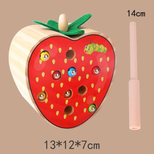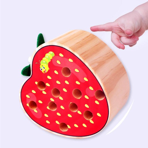 - Zabawa polega na chwytaniu drewnianym kijkiem zakończonym magnesem robaczków ukrytych w otworkach a następnie na ich ponownym wkładaniu. Jest to spore wyzwanie dla malucha - wymaga skupienia uwagi oraz sprawności manualnej.