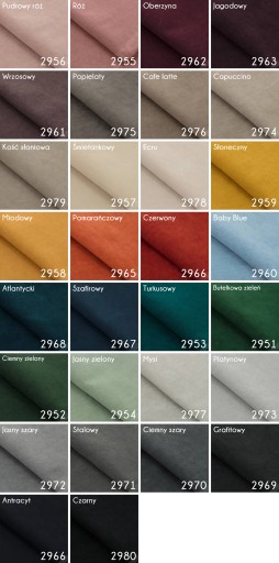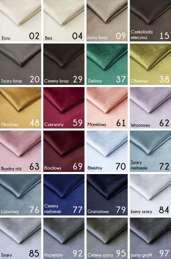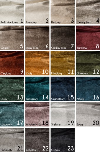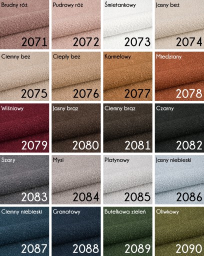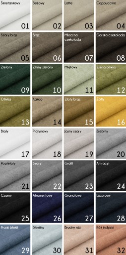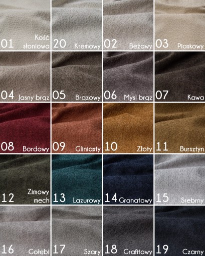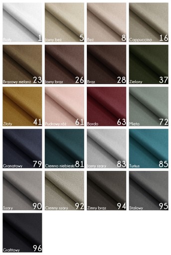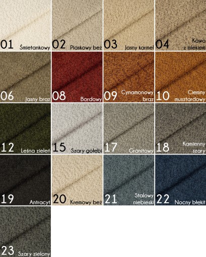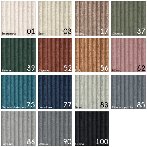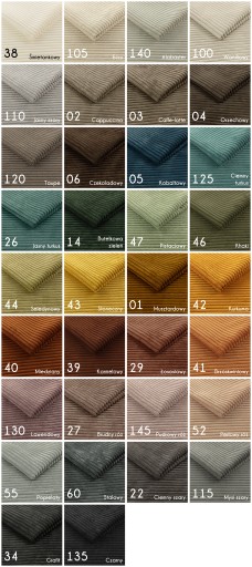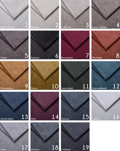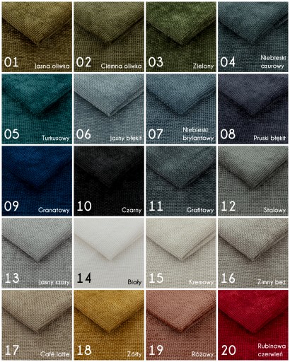 Uwaga: Odcienie tkanin mogą nieznacznie różnić się w zależności od ustawień wyświetlacza. Ze względu na różnice między partiami produkcyjnymi, tkanina na meblu może nieznacznie odbiegać od koloru próbki.