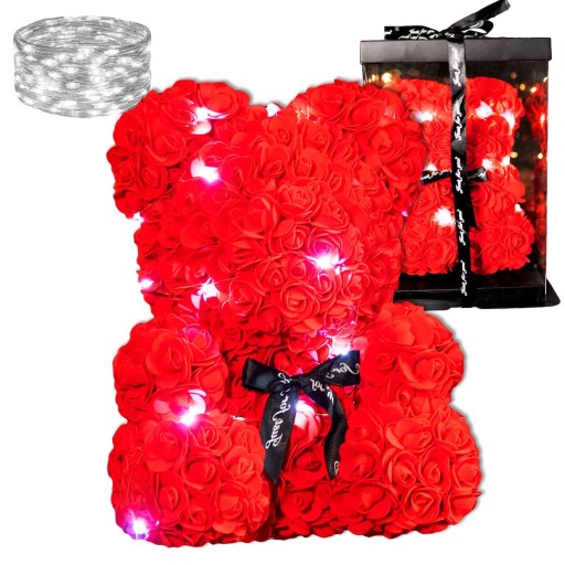 МЕДВЕДЬ С РОЗАМИ 30 СМ РОЗА МИШКА С ЛЕТЕСТЯМИ РОЗ БАНТ ПОДАРОЧНАЯ КОРОБКА+20LED