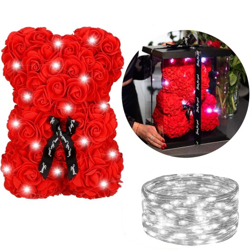 MIŚ Z RÓŻ CZERWONY LAMPKI 20 LED ZESTAW GIFTBOX