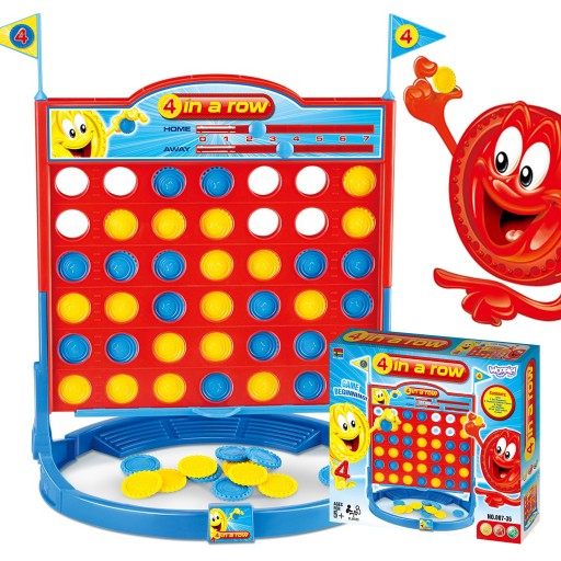 Gra 4 IN A ROW to gra logiczna dla całej rodziny. Wyjątkowa gra dla dwóch sprytnie myślących graczy. 4 IN ROW zapewnia dzieciom wspaniałą zabawę. Gra rozwija logiczne myślenie Twojego dziecka, ćwiczy umysł i koordynację wzrokową. Zawiera planszę oraz żetony w dwóch kolorach. Pierwszy gracz wrzuca jeden ze swoich żetonów do dowolnego otworu na górze planszy. Następnie drugi gracz umieszcza swój żeton, próbując jednocześnie blokować ruchy przeciwnika. Gracze ruszają się na zmianę.