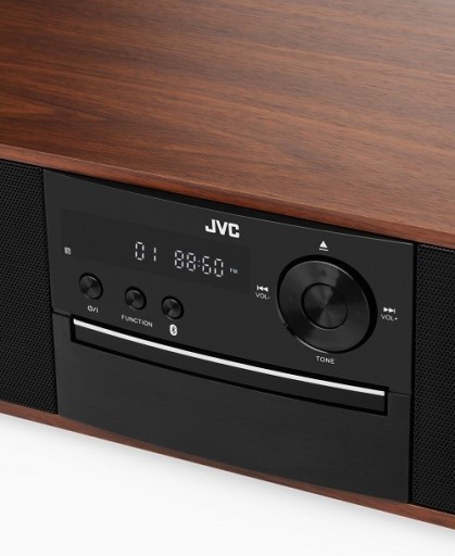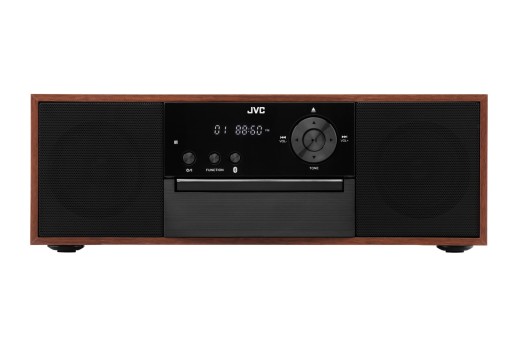 System audio All-in-One JVC RD-E761 to elegancki odtwarzacz stołowy z drewna, oferujący Bluetooth, tuner FM, odtwarzacz CD, wejście USB i AUX oraz konwersję CD na MP3. Moc 16W. Idealny do każdego wnętrza.