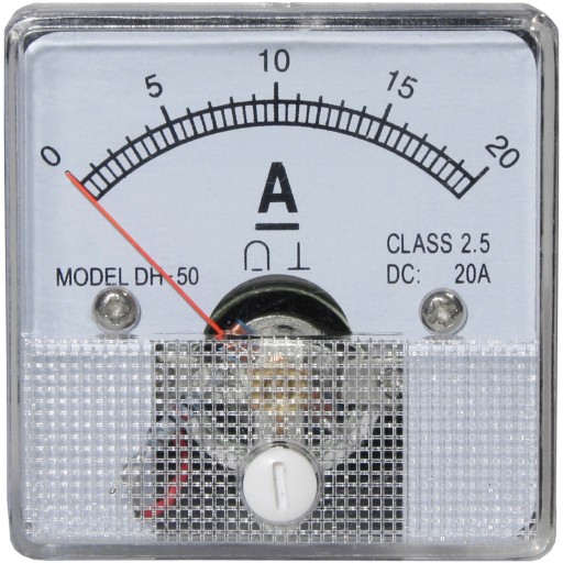 Miernik analogowy - amperomierz wraz z wbudowanym wewnętrznym specjalnym opornikiem (bocznik) pozwalającym na pomiar dużych wartości prądu. Wyraźne oznaczenia oraz przezroczysty panel przedni gwarantują dokładne i szybkie odczytanie pomiaru. Miernik został wmontowany w niewielkich wymiarów kwadratową obudowę wraz ze śrubami.