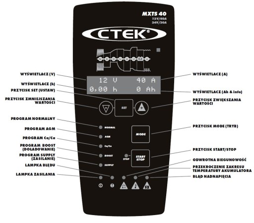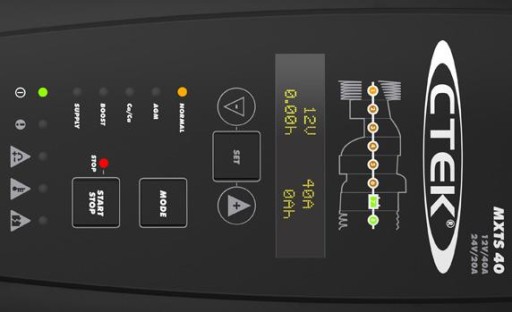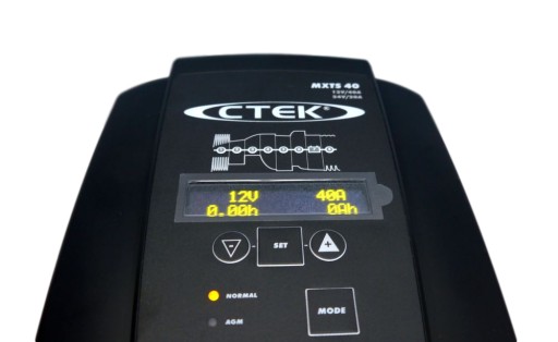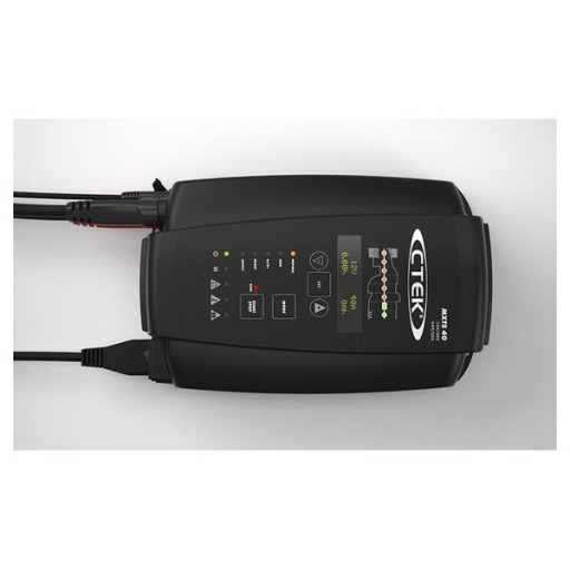 CTEK MXTS 40 to bardzo mocna ładowarka zaprojektowana według najnowocześniejszej technologii. Stworzona została do pracy z akumulatorami 12 V i 24 V, oferuje zaawansowaną technologię i jest bardzo łatwa w obsłudze. Ładowarka ta wyposażona jest w wyświetlacz pokazujący status ładowania, napięcie ładowania, prąd, czas ładowania (h) oraz pojemność (Ah), aby umożliwić kontrolę stanu akumulatora.