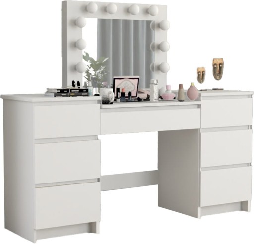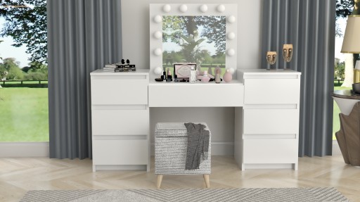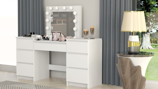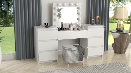 Mebel został wykonany w polskiej fabryce z wyjątkowo solidnych materiałów. Zastosowana gruba płyta meblowa oraz trwała okleina PCV 0,6 mm gwarantują długą żywotność i estetyczny wygląd przez lata. Siedem pojemnych szuflad pozwala zachować idealny porządek i wygodny dostęp do wszystkich kosmetyków.