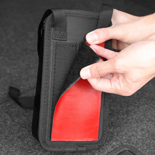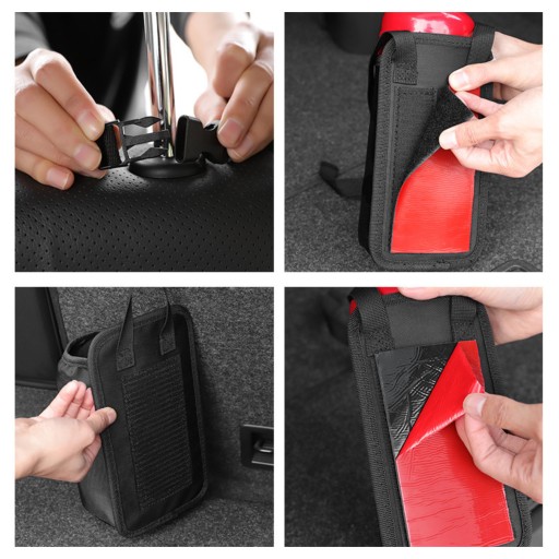 Dzięki rzepowi i paskom, pokrowiec można zamontować w różnych miejscach – na ściankach bagażnika, pod siedzeniem lub przy ścianie bagażowej – tak, aby gaśnica była zawsze łatwo dostępna, ale jednocześnie dyskretnie schowana.