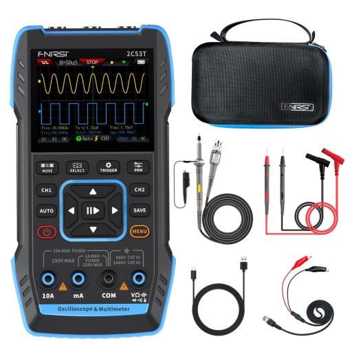 FNIRSI-2C53T to wszechstronny i bardzo praktyczny dwukanałowy oscyloskop cyfrowy typu „trzy w jednym” wprowadzony na rynek przez firmę FNIRSI, przeznaczony dla profesjonalistów z branży konserwacyjnej i badawczej. Urządzenie to łączy w sobie funkcje oscyloskopu, multimetru i generatora sygnału. Oscyloskop wykorzystuje architekturę sprzętową FPGA + ARM + ADC, oferując częstotliwość próbkowania 250MS/s, pasmo analogowe 50MHz i zintegrowany moduł ochrony przed wysokim napięciem, który obsługuje pomiary napięcia szczytowego do ±400V. Obsługuje również zapisywanie i przeglądanie zrzutów ekranu kształtu fali w celu dodatkowej analizy.