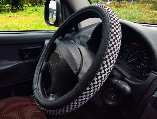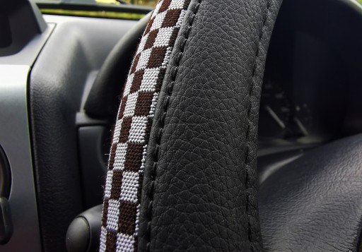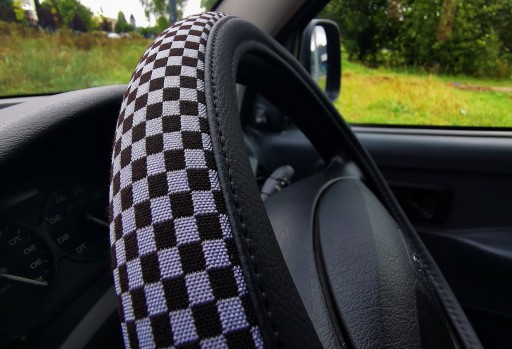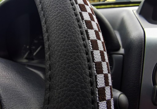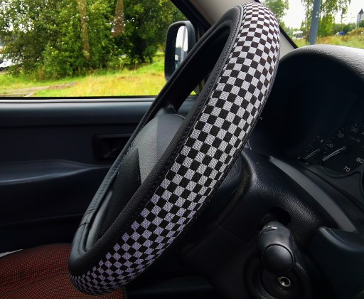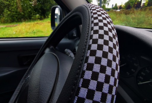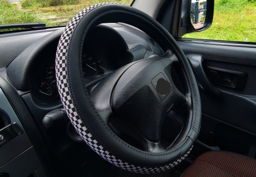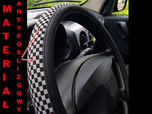 Pokrowiec na kierownicę z wysokiej jakości materiałów (ekoskóra-czarna połączona z materiałem antypoślizgowym szachownica-czarno szara).