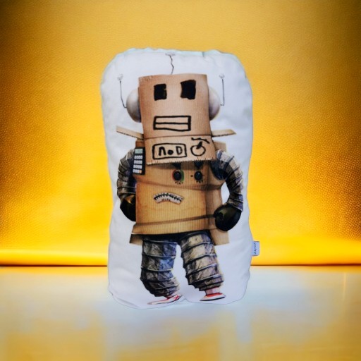 Stylowa ozdobna poduszka uszyta z mikrofazy z wzorem robota i z mięciutkiego polaru minky z tyłu w kolorze beżowym.