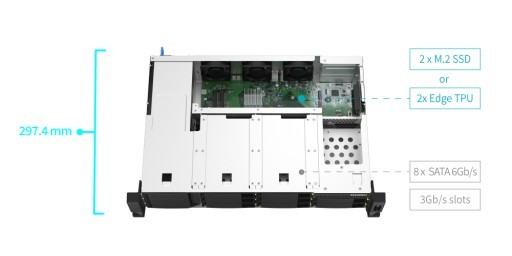 8-wnękowy model TS-873AeU jest wyposażony w dwa gniazda M.2 PCIe Gen3 x 1, które umożliwiają akcelerację pamięci podręcznej lub puli pamięci masowej SSD, zapewniając większą wydajność, lub Edge TPU do rozpoznawania obrazów w oparciu o sztuczną inteligencję.