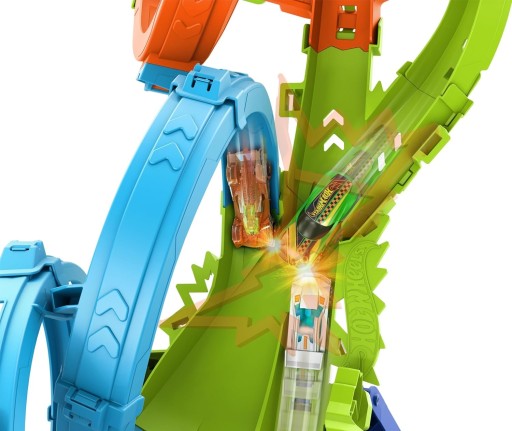 Załaduj dołączony samochodzik Hot Wheels w skali 1:64 do przyspieszacza i poślij go na spotkanie strefy kraks i aż 4 pętli!
