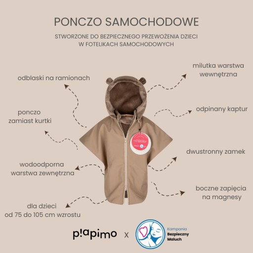 Ponczo samochodowe stworzone we współpracy Piapimo & ratowników medycznych Kampanii Bezpieczny Maluch – to bezpieczne przewożenie dzieci w fotelikach samochodowych.