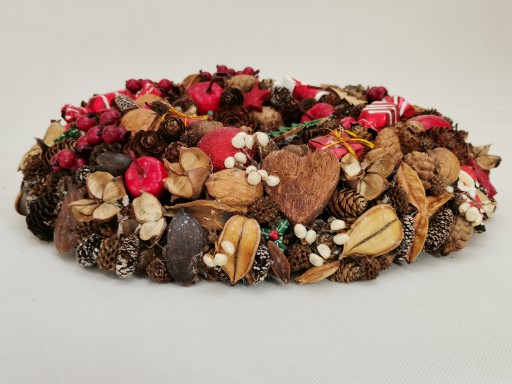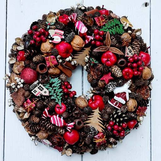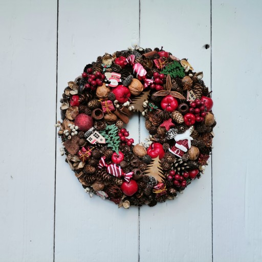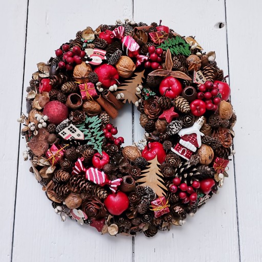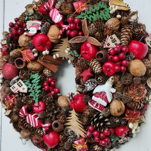 Prezentujemy Państwu w całości własnoręcznie wykonane wianki bożonarodzeniowe w wielu typowo świątecznych kolorach, ozdabiane dużą ilością różnego rodzaju szyszek, naturalnymi dodatkami jak orzechy, cynamon, suszone owoce, zielonymi gałązkami oraz akcesoriami florystycznymi i bombkami.
