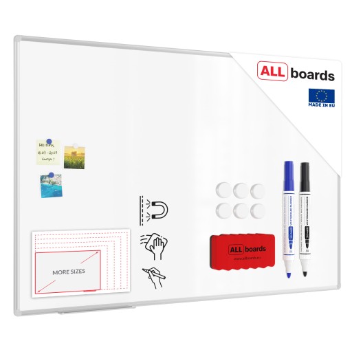 - POWIERZCHNIA - magnetyczna tablica ALLboards wykonana jest z blachy lakierowanej na biało, co zapewnia idealnie gładką powierzchnię, łatwość w czyszczeniu oraz długoletnią wytrzymałość. Powierzchnia tablicy pozwala na używanie markerów ścieralnych oraz wszelkiego rodzaju magnesów.