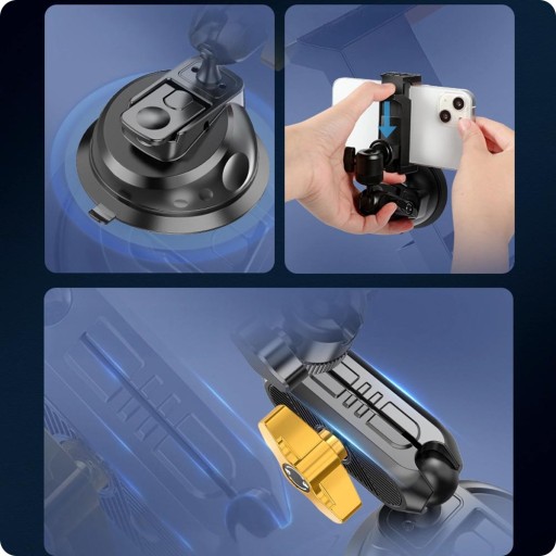 ✔️ Mocna przyssawka z zaciskiem – Gwarantuje stabilne mocowanie na gładkich powierzchniach, takich jak szyby, deski rozdzielcze, okna czy metal.