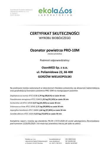 Na podstawie przeprowadzonych badań laboratoryjnych wykonanych przez niezależne, akredytowane laboratorium Ekolabos sp. z o.o., potwierdzono wysoką skuteczność bakteriobójczą i grzybobójczą naszego ozonatora powietrza PRO-10M. W ciągu zaledwie 30 minut urządzenie wykazało się eliminacją aż 99,80% Enterococcus hirae, 98,81% Staphylococcus aureus oraz 97,80% Aspergillus brasiliensis. Skuteczność wobec innych patogenów, takich jak Pseudomonas aeruginosa (95,54%) czy Candida albicans (76,82%), potwierdza jego szerokie spektrum działania.